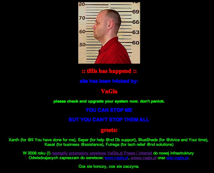 - Dalej blog Piotra Waglewskiego – vagla.pl. Strona została przeniesiona na nowe adresy jeszcze w 2006 roku, a zostało to zaanonsowane w dość humorystyczny sposób sugerujący włamanie. Żeby nie było niejasnośc wyraźnie było tam napisane – hacked by Vagla. Dla niedowiarków dowód poniżej: