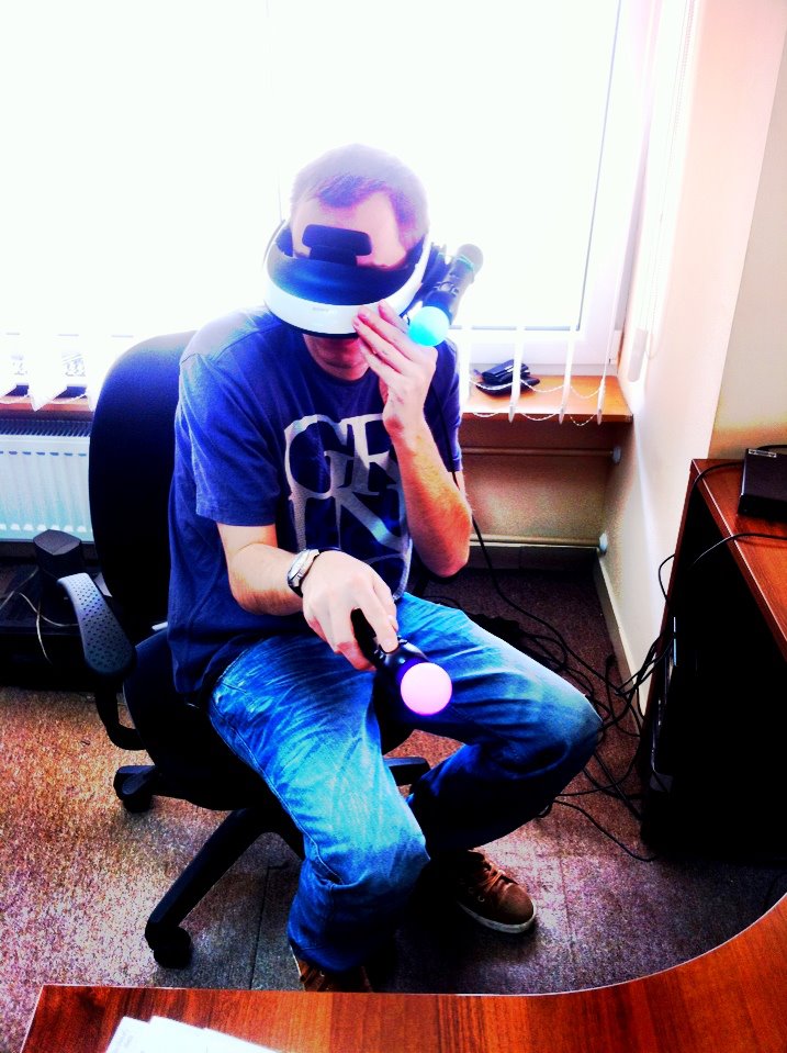 Był też specjalny hełm. Nowa generacja VFX1 od Sony. Lżejszy i wygodniejszy, ale jednak dający dużo mniejsze wrażenia. Mimo, iż teoretycznie powinien przenosić nas w wirtualną rzeczywistość i pozwolić utonąć w grze wrażenia były dużo gorsze. Przede wszystkim zsuwał się z głowy, co frustrowało gracza, widzieliśmy przed sobą czarną obwódkę końca ekranu, która nie pozwalała zapomnieć, o rzeczywistości, widać też było świat zewnętrzny pod okularami.