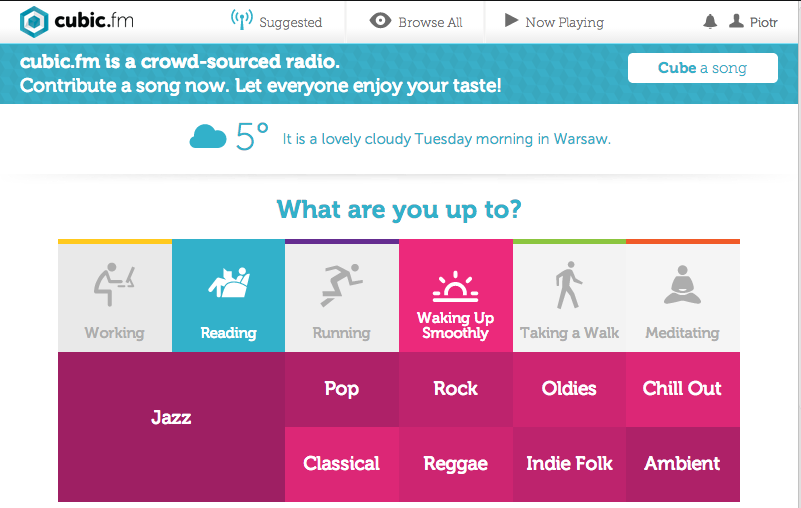 Jak to działa? Cubic,fm zgarnia naszą lokalizację, godzinę, pogodę, każe wybrać nam aktywność i styl muzyki po czym zaczyna grać muzykę poleconą dla tego gatunku i działalności przez innych użytkowników. Mamy więc taki moderowany crwosourcing, który póki co całkiem nieźle się sprawdza. Utwory praktycznie zawsze pasują do sytuacji, można też poznać sporo nowych kawałków.